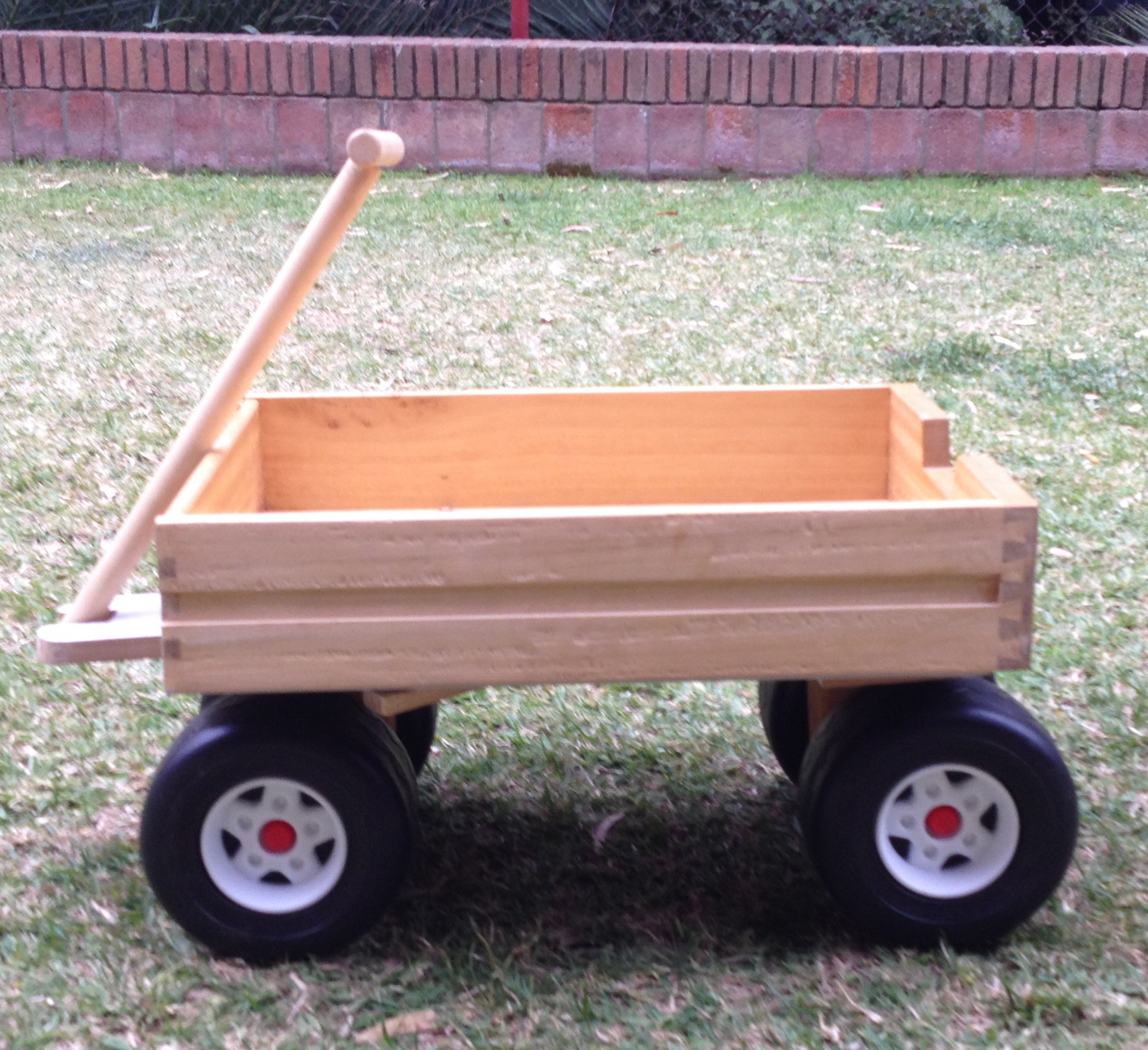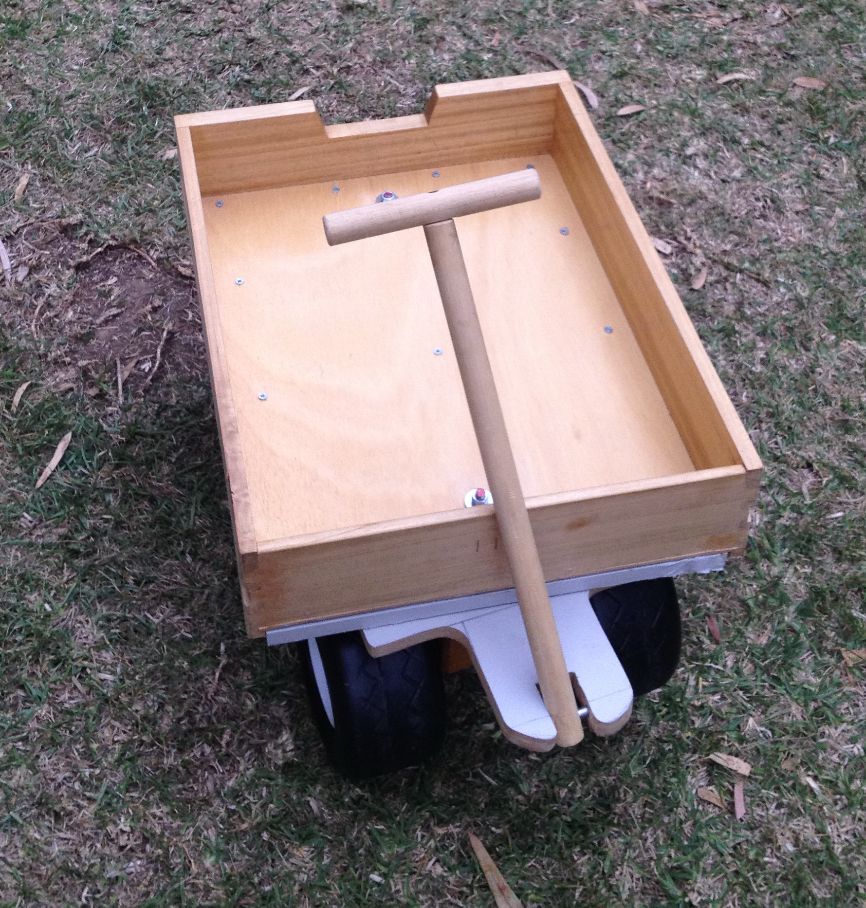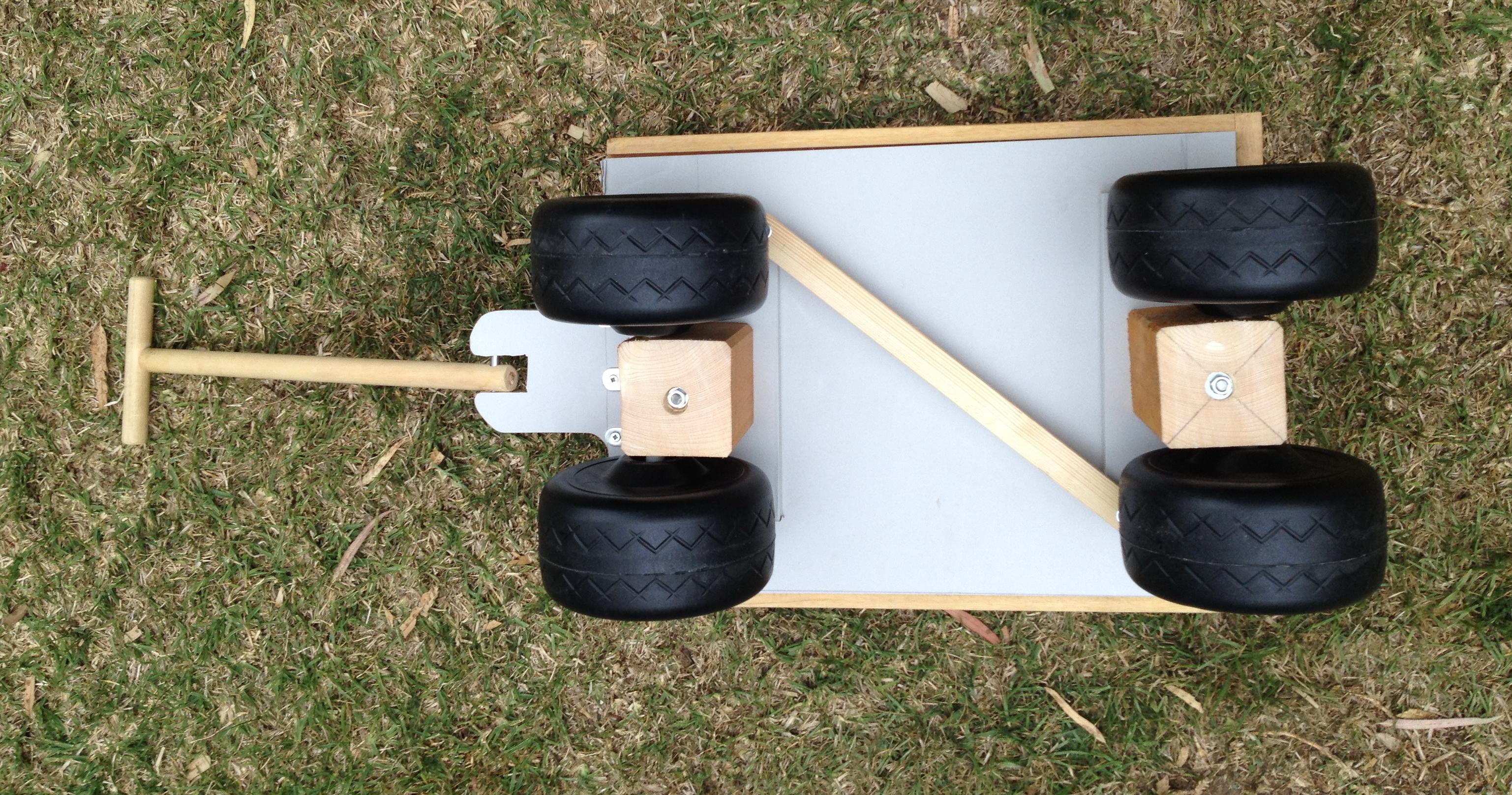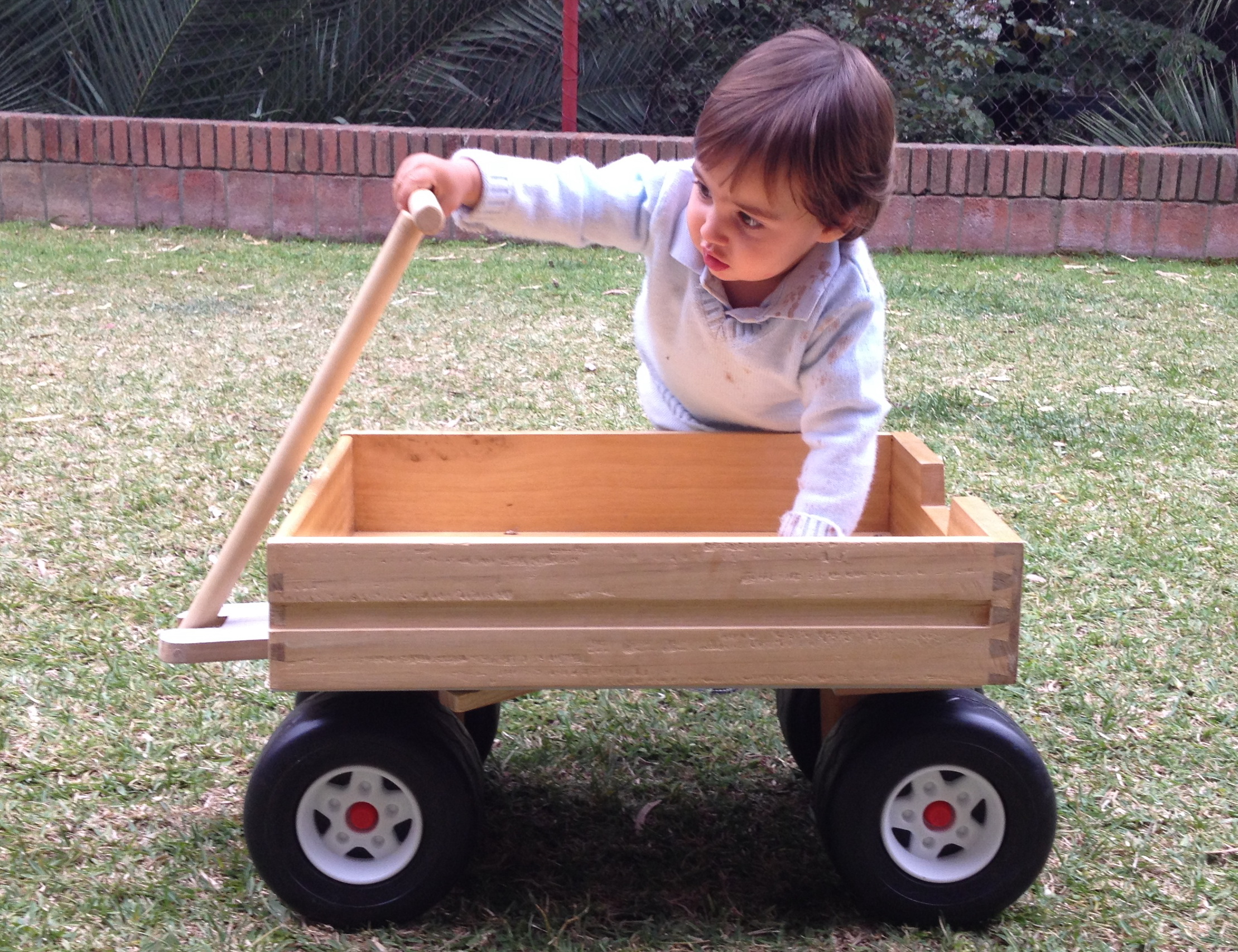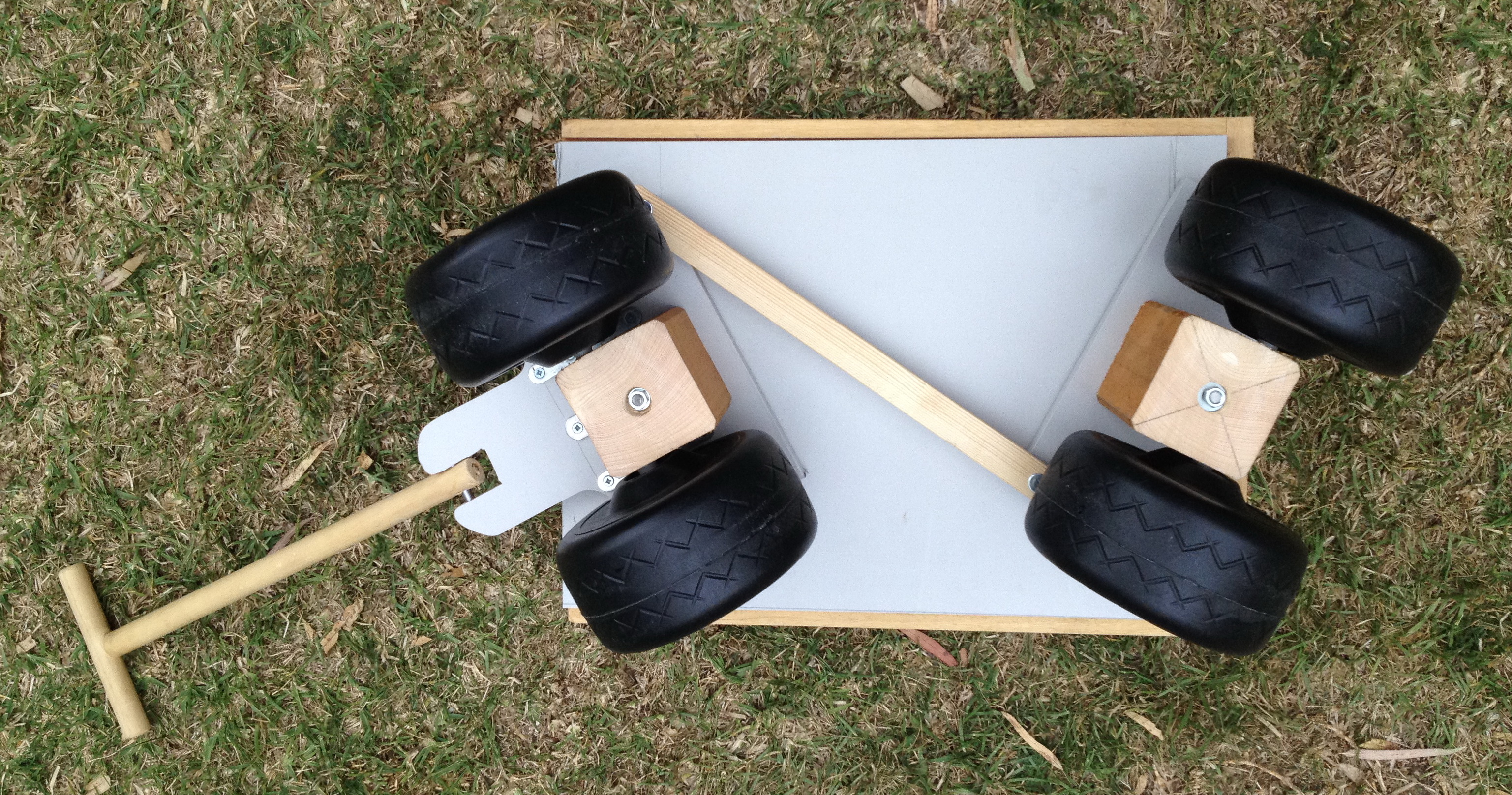 Proyecto de reciclaje: un cajón de basurero, unas ruedas de juguete roto. Simple pero funcional para que los niños jueguen en el jardín.