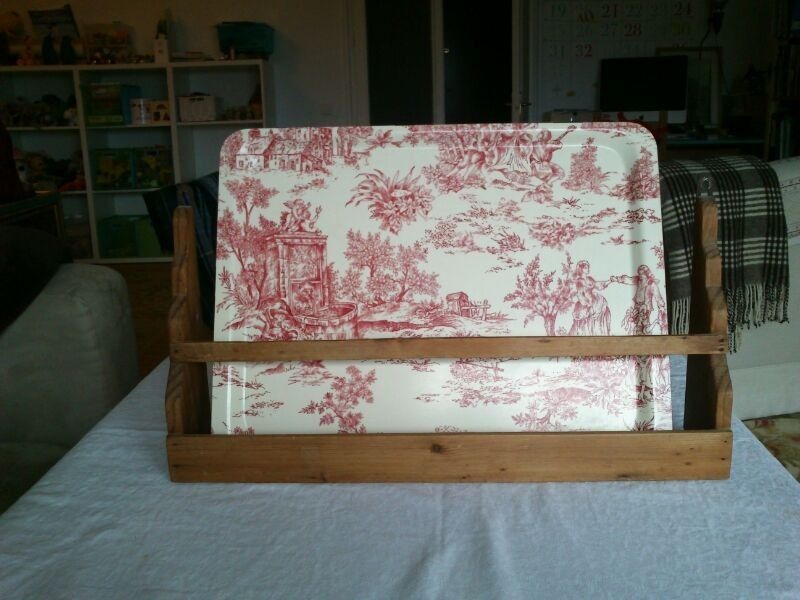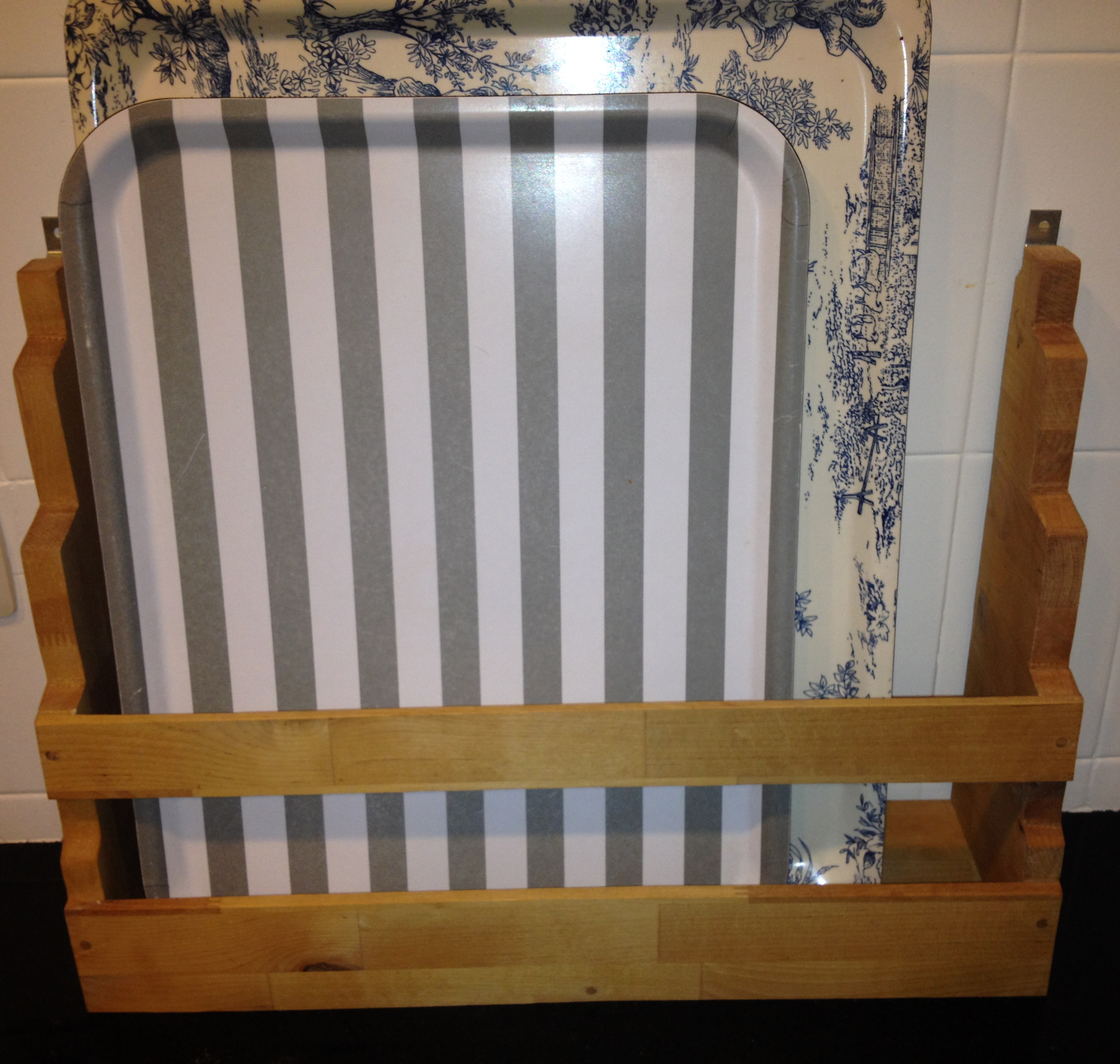Proyecto muy sencillo con madera reciclada. Ideal para organizar bandejas en la cocina de forma vertical y ahorrar espacio.