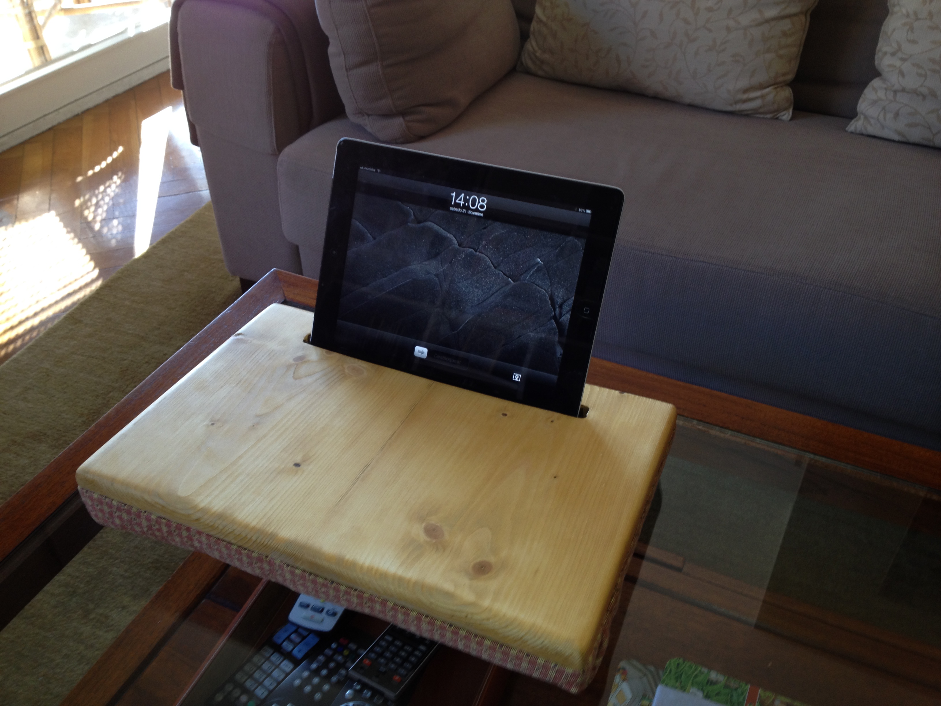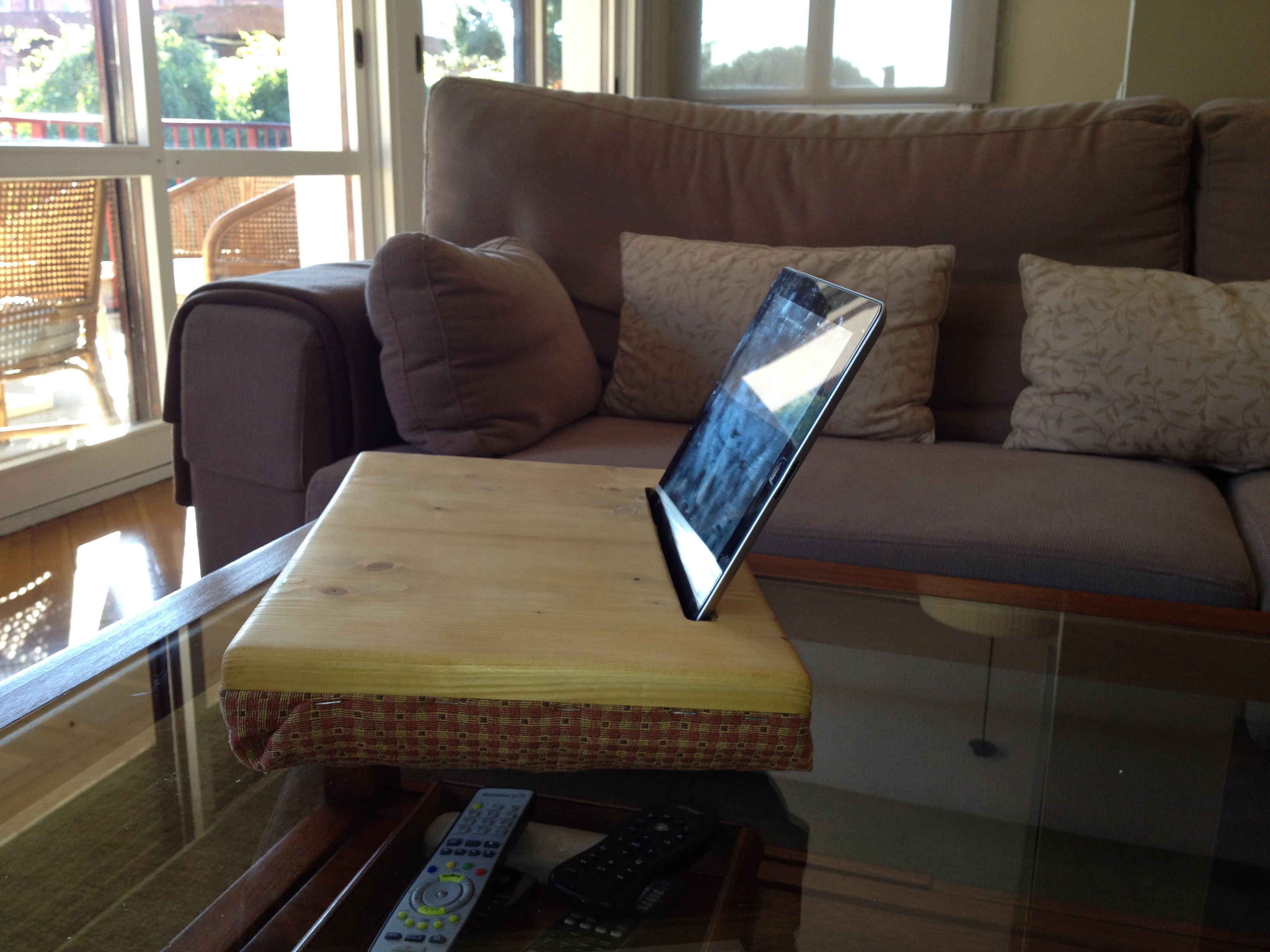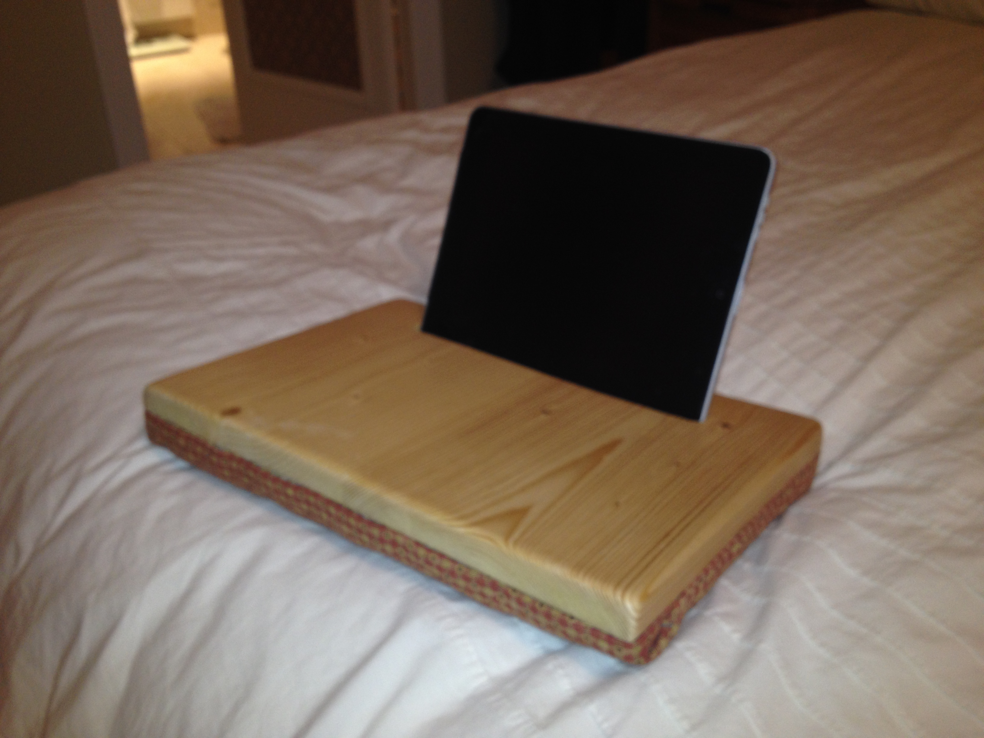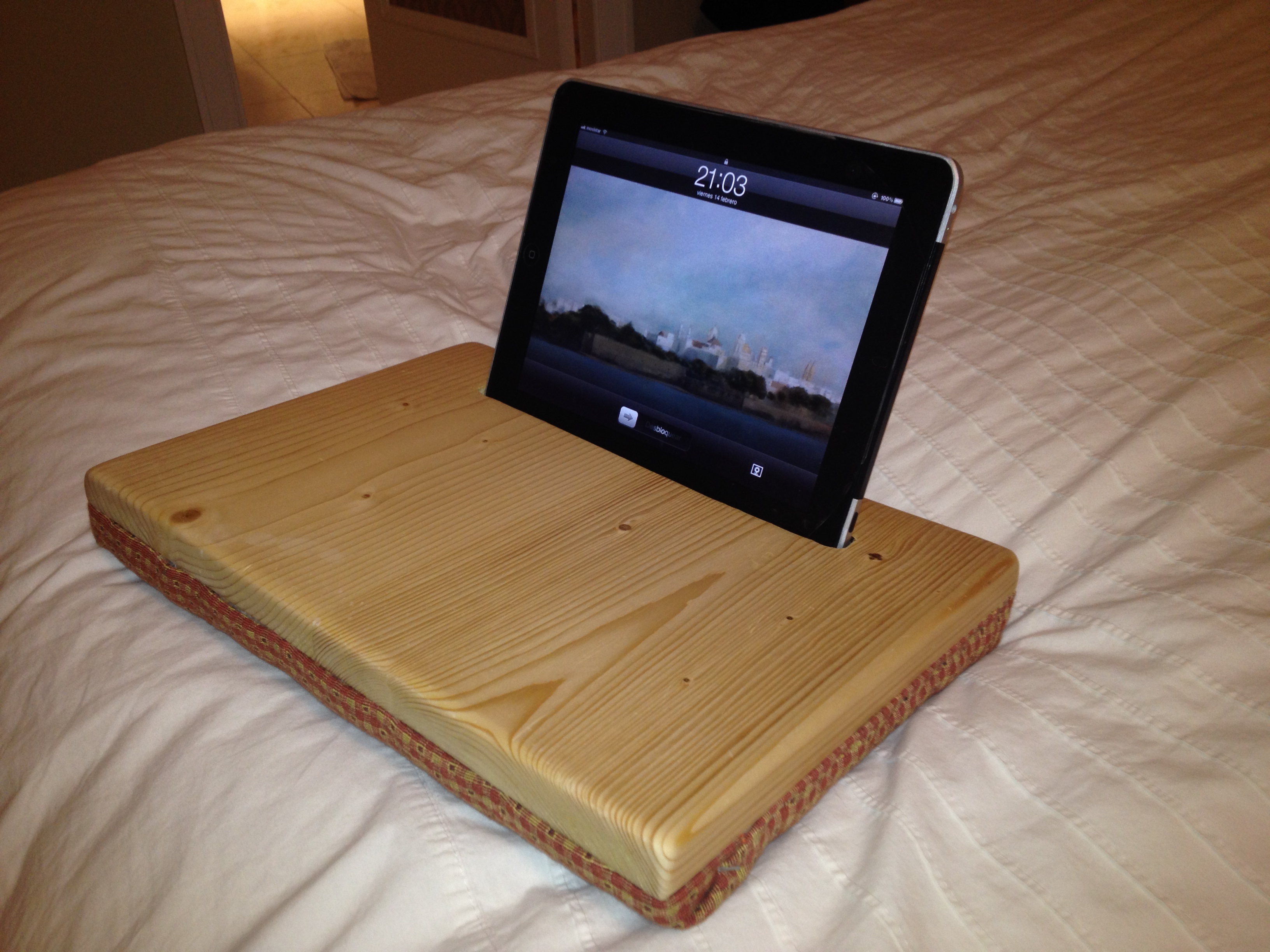 Proyecto muy sencillo ideal para regalos de navidad. Útil para todas las edades y elegante por su madera y las telas. Un soporte cómodo para usar la tablet en el sofá o la cama.