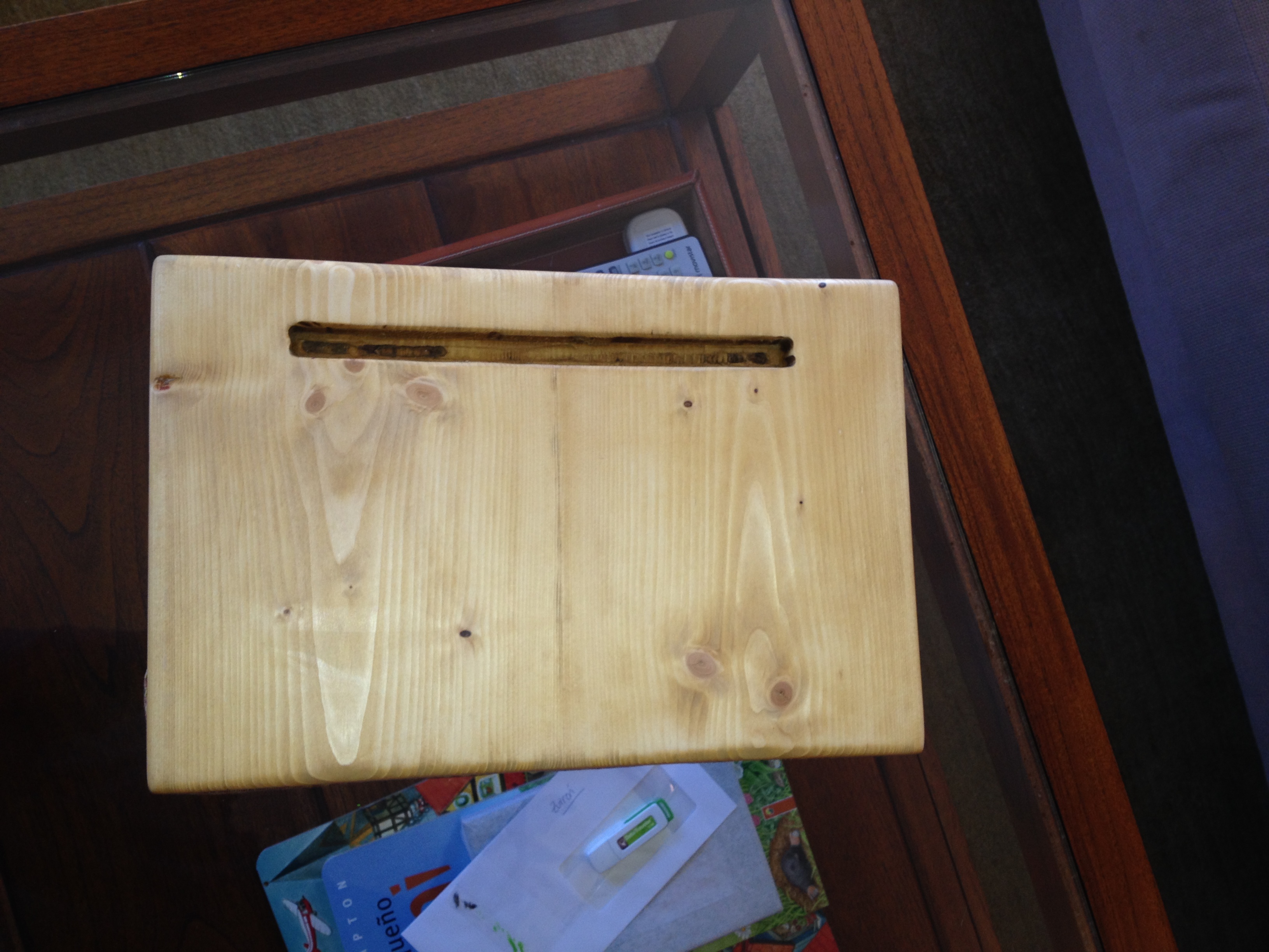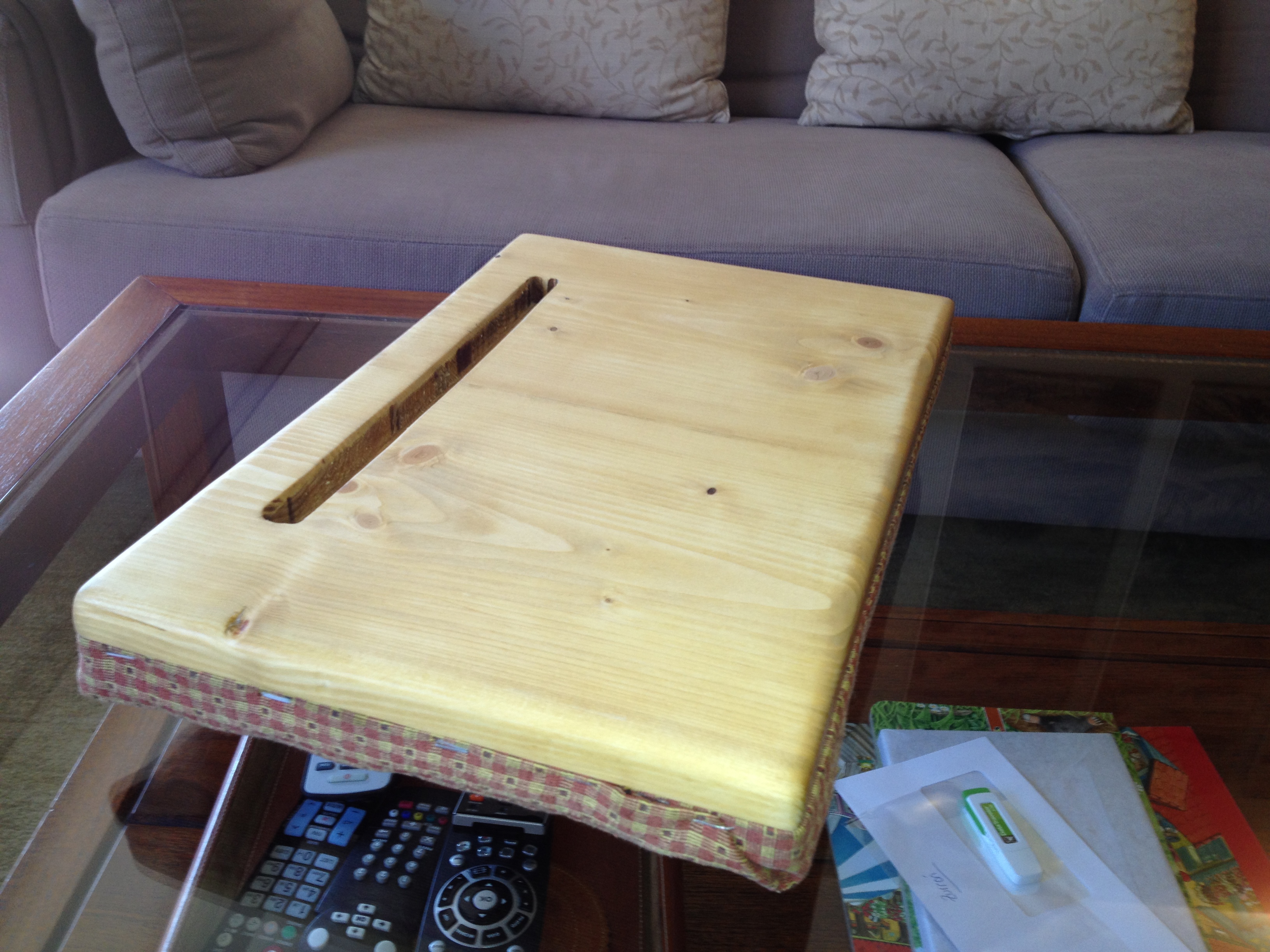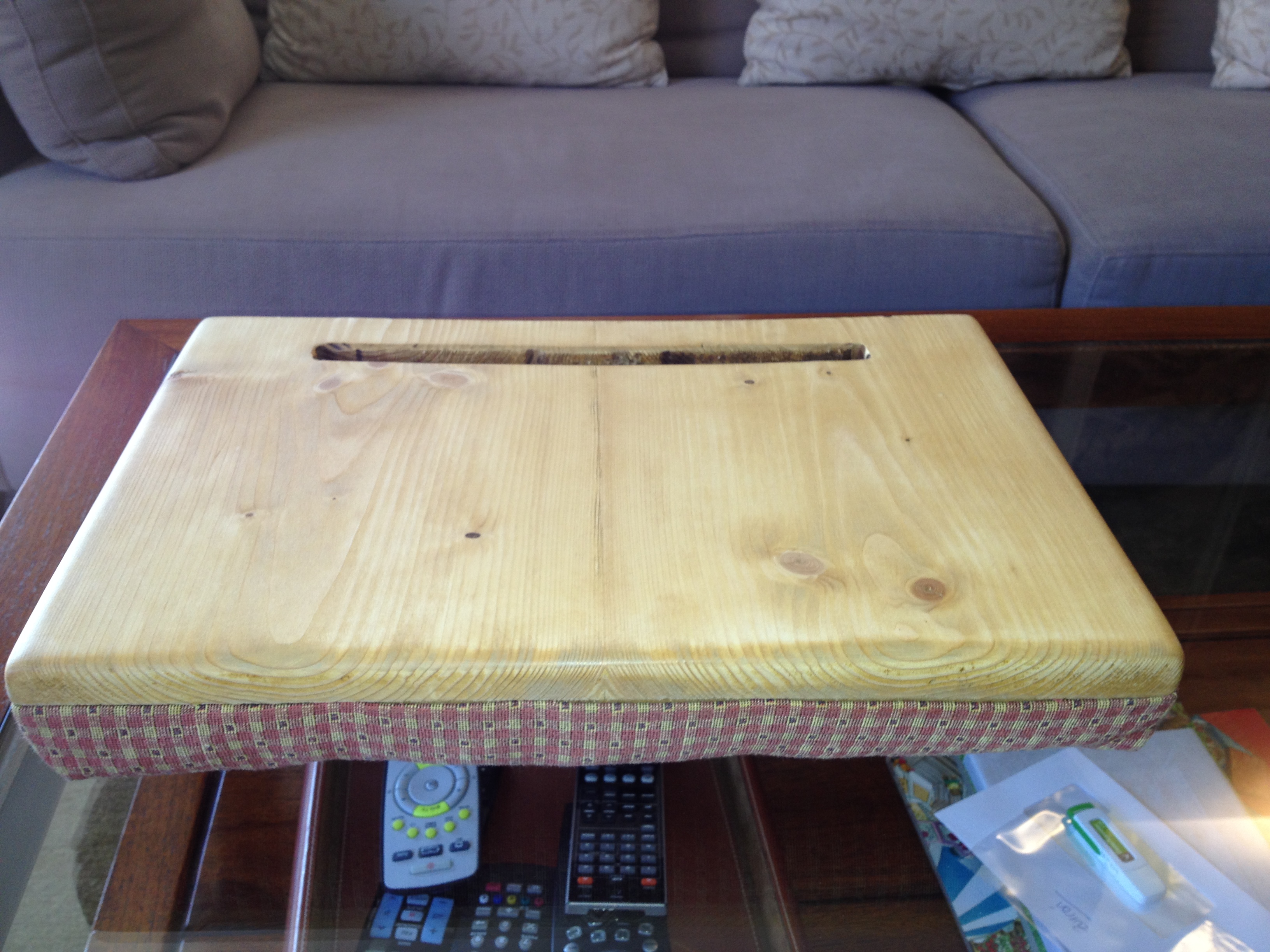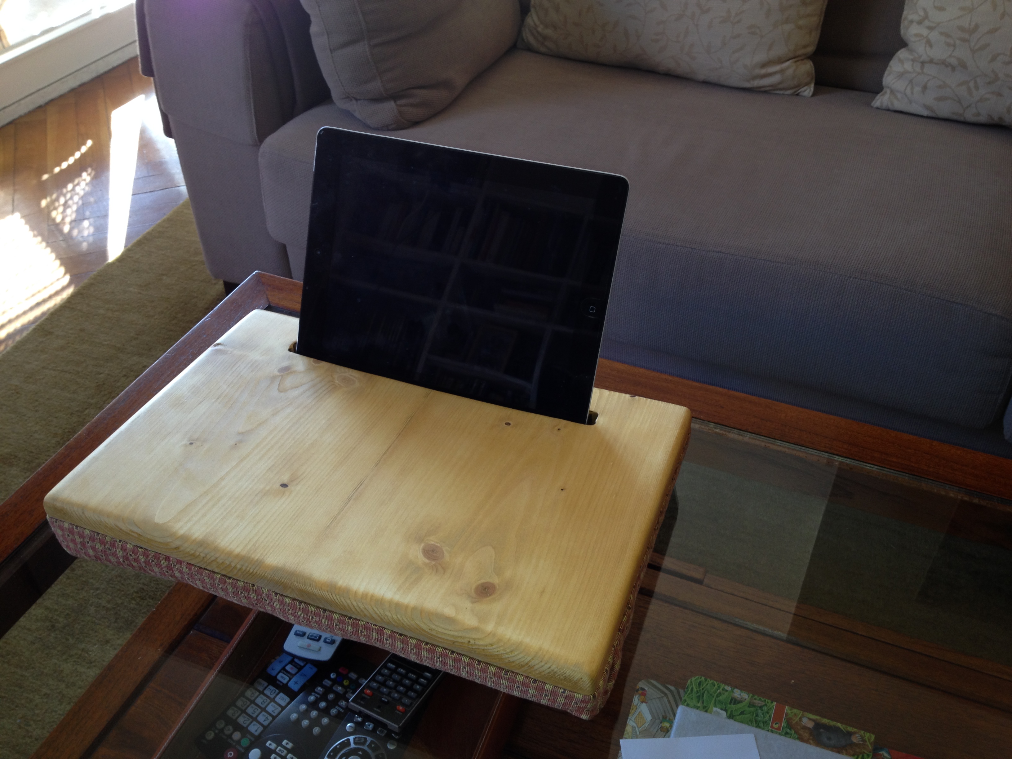 Proyecto muy sencillo ideal para regalos de navidad. Útil para todas las edades y elegante por su madera y las telas. Un soporte cómodo para usar la tablet en el sofá o la cama.
